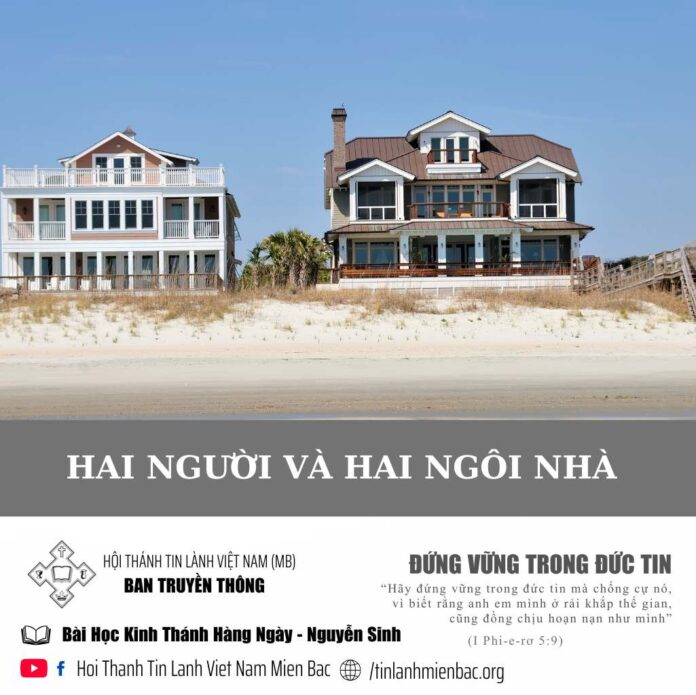 Suy niệm: Đây là những lời dạy của Chúa Giê-xu dành cho những người đã tin nhận Chúa, đã xưng mình là môn đệ. Hình ảnh đưa ra là hai người cùng tự nhận là tín đồ của Chúa cả. Nhưng một người thực sự đã được tái sinh, làm con thật của Chúa, và người thứ hai tưởng rằng mình cũng là tín đồ thật. Tại đây có hai cuộc so sánh song song. Hai người và hai ngôi nhà. Có những nét giống nhau và khác nhau.