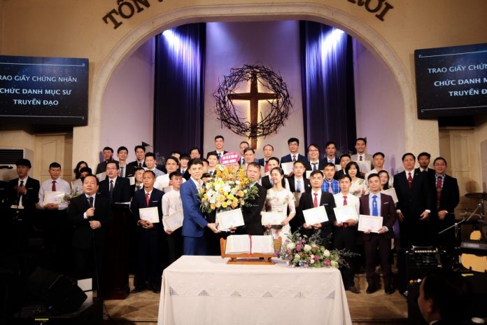 Sáng thứ hai (ngày 4/4) tại nhà thờ Tin lành Hà Nội đã diễn ra lễ công bố chức danh Mục sư nhiệm chức, truyền đạo cho 46 quý tôi tớ Chúa đang hầu việc Chúa tại khu vực miền xuôi và các sinh viên Trường Thánh Kinh Thần Học Hà Nội Khoá II.
