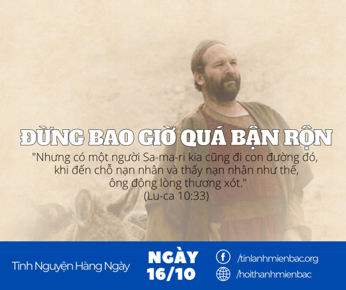Thật dễ dàng để trở nên bận rộn tới mức bạn chẳng biết gì về những người đang có nhu cầu. Lịch của bạn có thể đầy ắp những công việc tốt cần phải hoàn thành đến nỗi bạn không giúp được gì cho những người xung quanh mình. Chúa đang hành động trong cuộc sống của bạn bè, hàng xóm, và những người thân trong gia đình bạn đó. Ngài có thể yêu cầu bạn tạm ngưng công việc hằng ngày để dành đủ thời gian cùng Ngài quan tâm chăm sóc họ. Không có việc gì trong lịch trình của bạn, cho dù phải gấp rút thế nào, hội đủ lý do để phớt lờ tiếng nói của Chúa khi Ngài bảo bạn dừng lại và giúp đỡ người khác. Nếu bạn trở nên quá bận rộn đến nỗi không thể phục vụ những người xung quanh, hãy xin Chúa giúp bạn thiết lập lại các thứ tự ưu tiên để bạn không bỏ lỡ những cơ hội phụng sự Ngài.